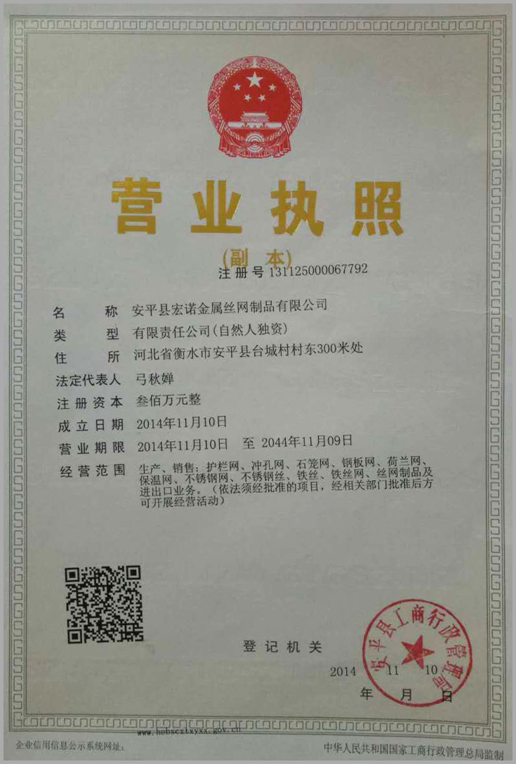 您的位置:安平县宏诺金属丝网制品有限公司>>企业资质